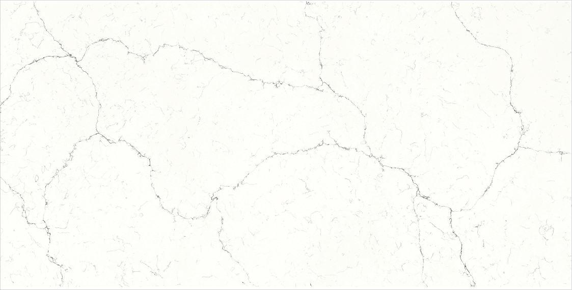 Calacatta quartz with soft white hues and bold, dramatic veining.